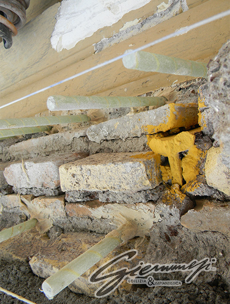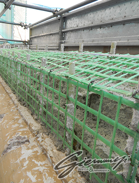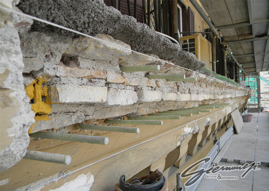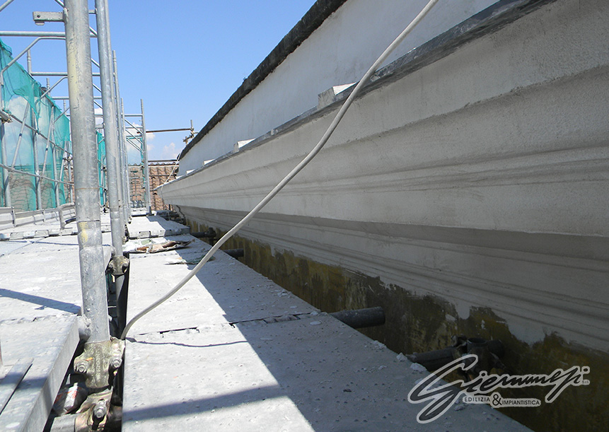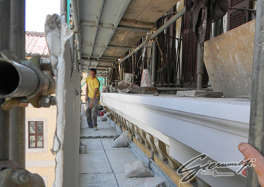 Esempio di fedele ricostruzione di un cornicione storico in aggetto con materiali in GFRP ( Glass Fiber Reinforced Polymer ) costituite da fibre di vetro impregnate con resine epossidiche. Modellatura  con modine in calce naturale fibrorinforzata.