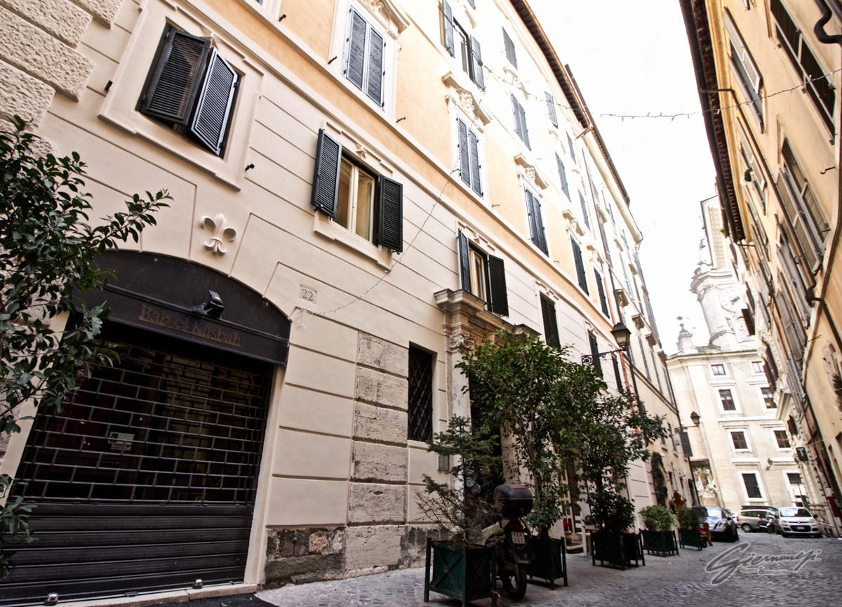 L’immobile identificato ai numeri civici n° 22, 24 e 26 di Via dei Banchi Nuovi e n° 4, 5 e 6 di Vicolo San Giuliano costituisce la porzione d’angolo di un isolato incluso nel Rione V, nominato Ponte, come da mappatura del Catasto Urbano di Roma, e pur non costituendone parte monumentale ne forma un importante tassello del tessuto edilizio.
